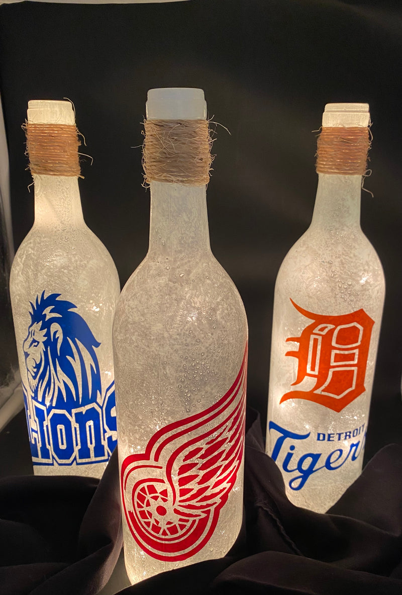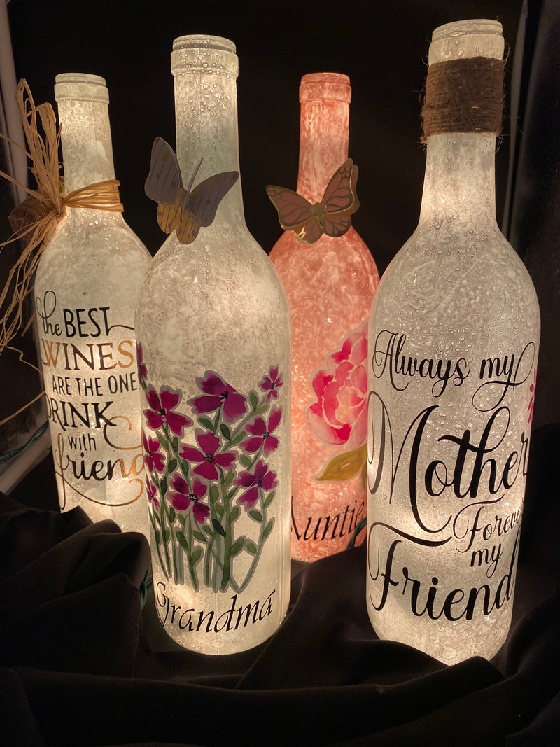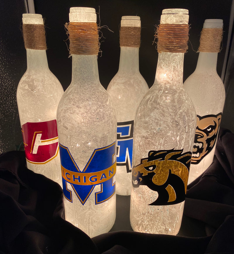 Under the Stairs makes decorative light wine bottles with an array of different designs. Custom orders are welcome! Various styles including seasonal styles and all colors are available!